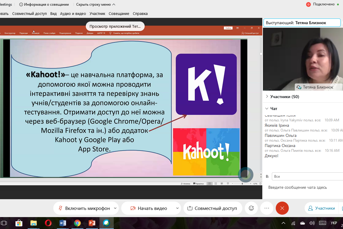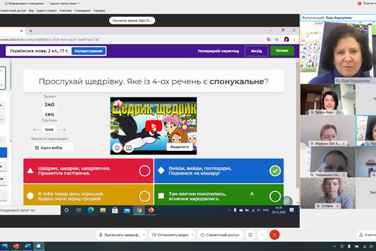 Предметом обговорення були питання про інноваційні процеси в сучасній освіті, суспільні виклики дистанційного та змішаного навчання, профілактику професійного вигорання вчителів та ін. Основну частину тренінгу було присвячено вивченню педагогічних можливостей безкоштовного онлайн-сервіса Kahoot для проведення інтерактивного опитування, створення тестувань, інтерактивних вікторин тощо. Практична частина тренінгових занять передбачала презентацію власних розробок вчителів на платформі Kahoot згідно з навчальною програмою для закладу загальної середньої освіти. Педагоги розробили тести та інтерактивні завдання для використання у віртуальній школі свого закладу до конкретних тем свого предмета.