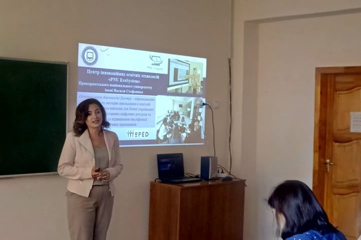 Директорка Центру, професорка Олена Будник ознайомила учасників із можливостями Центру «PNU-EcoSystem» щодо професійного розвитку, механізму підвищення кваліфікації педагогічних працівників на базі університету. Зокрема, було представлено освітні програми для вчителів і керівників закладів освіти, які розроблені та апробовані в рамках проєкту програми ЄС ERASMUS+ «MoPED – Модернізація вищої педагогічної освіти з використання інноваційних інструментів викладання» (№586098-EPP-1-2017-1-UA-EPPKA2-CBHE-JP), подано інформацію про основні змістові напрями тренінгів, як: розвиток цифрових компетентностей педагогів та учнів, використання інформаційно-комунікативних та цифрових технологій в освітньому процесі, формування професійних компетентностей галузевого спрямування, створення інклюзивного освітнього середовища, розвиток управлінської компетентності (для керівників закладів освіти, науково-методичних установ та їхніх заступників) та ін.