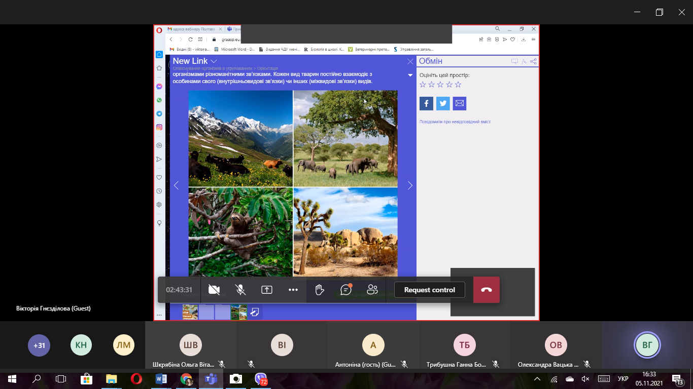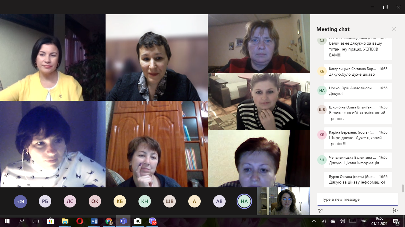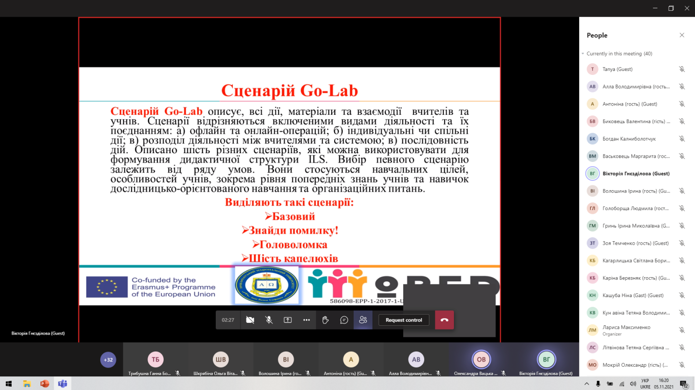 4 і 5 листопада команда тренерів Центру інноваційних освітніх технологій «PNU EcoSystem»: професорка, д.п.н. Будник Олена Богданівна (директор Центру), доцентка, к.п.н. Близнюк Тетяна Олександрівна та доцента, к.б.н. Гнєзділова Вікторія Ігорівна провели тренінг «Дослідницько орієнтоване навчання школярів з використанням онлайн лабораторій». Навчання відбулося на запрошення методиста Полтавського обласного інституту післядипломної педагогічної освіти ім. М.В.Остроградського Лариси Миколаївни Максименко. До курсів підвищення кваліфікації, що відбувалися на платформі Microsoft Teams, були залучені вчителі біології, хімії, фізики та математики Полтавської області. Слухачі активно працювали на платформі Graasp, ознайомилися з різноманіттям онлайн лабораторії у Go-Lab, а також навчалися створювати ILS та наповнювати їх навчальним контентом.