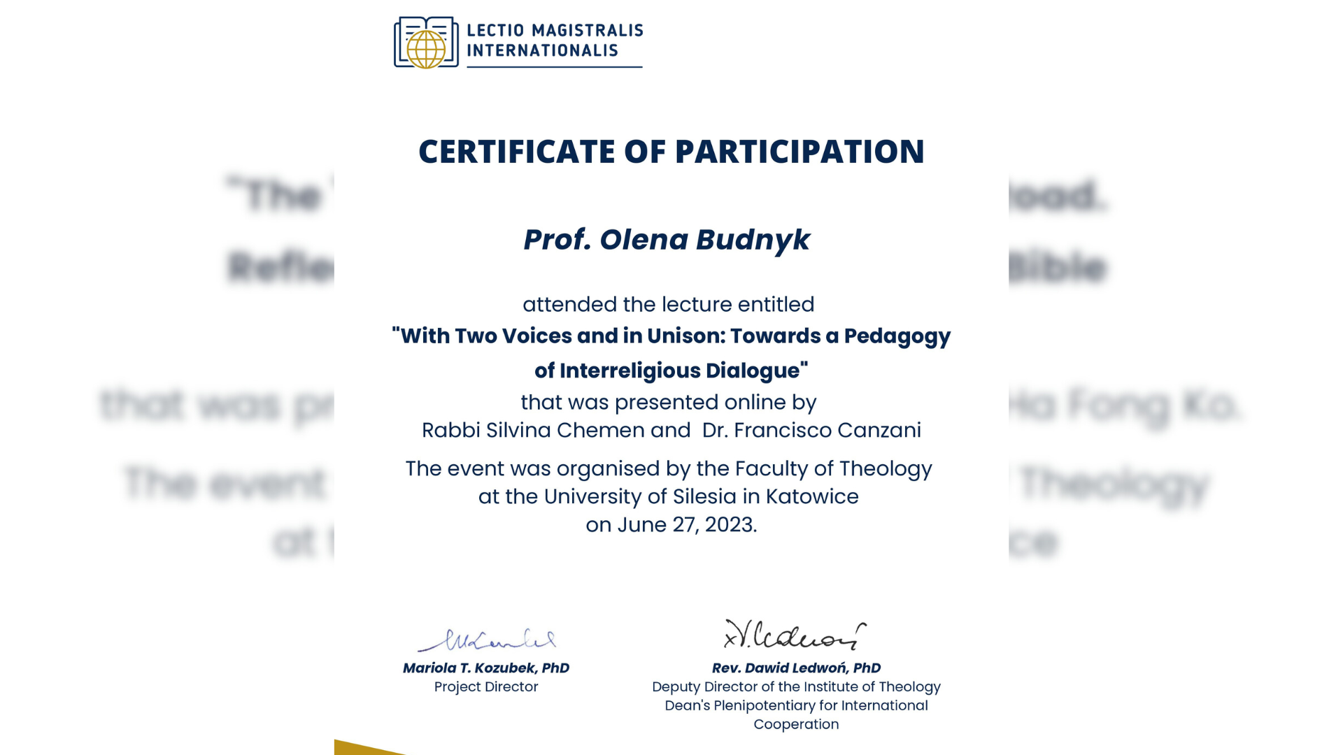 27 червня професорка Олена Будник та доцентка Катерина Фомін взяли участь у міжнародному вебінарі Lectio Magistralis Internationalis, організатором якого є Сілезький університет в Катовіце (Республіка Польща). У форматі онлайн до заходу було залучено близько 100 учасників з різних країн (Італія, Аргентина, Кенія, США, Бразилія, Словаччина, Україна, Іспанія та ін.) із забезпеченням синхронного перекладу на польську мову з італійської та англійської.