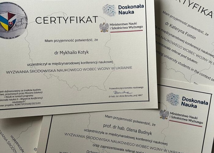 Команда Центру – проф. Олена Будник, доц. Катерина Фомін і ст. викладач Михайло Котик – взяла участь Міжнародній науковій конференції «Виклики наукової спільноти під час війни в Україні», яка була організована Військовою технологічною академією у Варшаві за підтримки Міністерством освіти і науки Польщі. Захід, який відбувся 6-8 листопада, об’єднав учених з Польщі, України та Словаччини. Доповіді усіх учасників торкнулися різних аспектів російсько-української війни (безпекового, психологічного, педагогічного, економічного, політичного, технологічного та ін.). Зокрема, значна увага була приділена педагогічним аспектам організації освітнього процесу та використанні логотерапії Віктора Франкла для психологічного супроводу дітей, які мають травми війни (проф. Олена Будник), використанню ІКТ у підготовці майбутніх фахівців в умовах воєнного стану (доц. Катерина Фомін), викликам воєнної комп’ютерної інженерії (ст. викладач Михайло Котик). Обговорено перспективи подальших наукових пошуків окресленої проблеми і міжнародної співпраці.