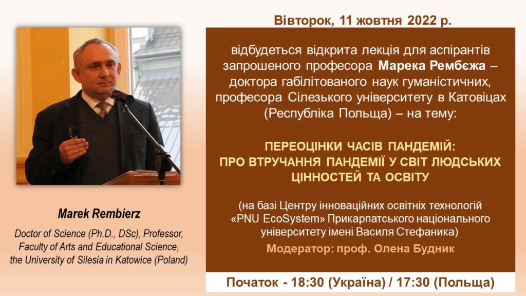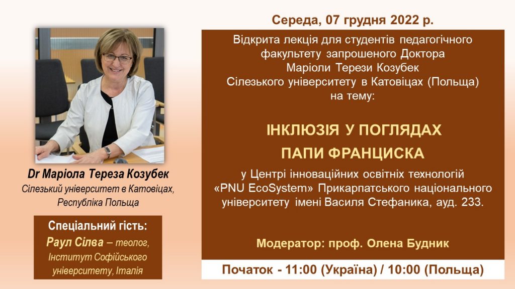 07 грудня (середа) у Центрі інноваційних освітніх технологій «PNU EcoSystem» Прикарпатського національного університету імені Василя Стефаника (ауд. 233 ц.к.) відбудеться відкрита лекція запрошеного Доктора Маріоли Терези Козубек Сілезького університету в Катовіцах (Республіка Польща) на тему: Інклюзія у поглядах Папи Франциска Спеціальний Читати далі