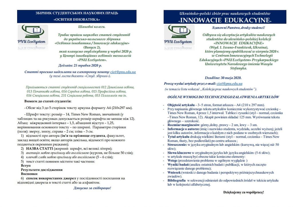 Бер 30 Триває прийом наукових статей студентів до українсько-польського збірника «Освітня інноватика / Innowacje edukacyjne» (Вип. 2, 2020)