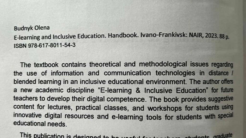 Olena Budnyk’s textbook “E-Learning and Inclusive Education” (2023) has been published, proposing a wide range of electronic resources for teaching students in inclusive settings. The book has been published in English and is recommended for educational institutions to train future teachers in EU countries.
