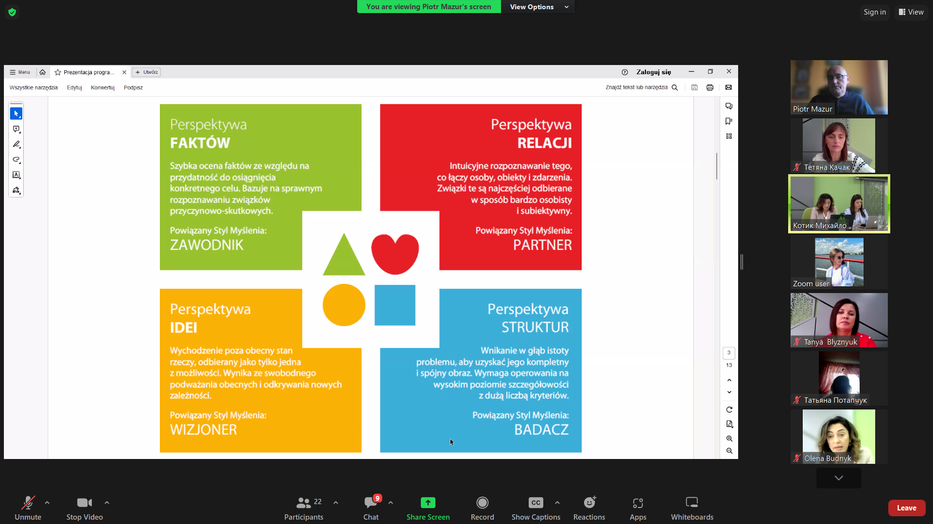 During the workshop, the participants were introduced to the key differences in ways of thinking and acting based on four cognitive aspects: Facts (information) Relationships (interaction) Ideas Structures. The FRIS model is an original concept that illustrates the possibilities of pedagogical cooperation, considering the four styles of thinking and taking into account this uniqueness to enhance the team’s potential and achieve synergy.