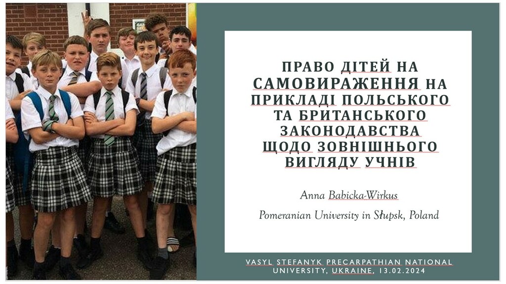 In her speech, Professor Anna Babicka-Wirkus reflected on the theoretical aspects of the issue in the scientific literature, in particular, the significance of school uniforms and the appearance of participants in the educational process in terms of equality, discrimination, discipline, gender, mentality, religious traditions, etc. based on Peter McLaren’s concepts of the subordination of the body by the dominant culture and Michel Foucault’s concept of security. Considerable attention was paid to the presentation of the current state of children’s rights to free expression in the area of appearance and clothing, as well as understanding the mechanisms of subordination of students’ bodies in the school environment; exploring the similarities and differences between the school policies of the UK and Poland in this regard. Emphasis is placed on the importance of respecting students’ rights, ensuring their freedom and creating conditions for self-expression and creativity in the educational institution.